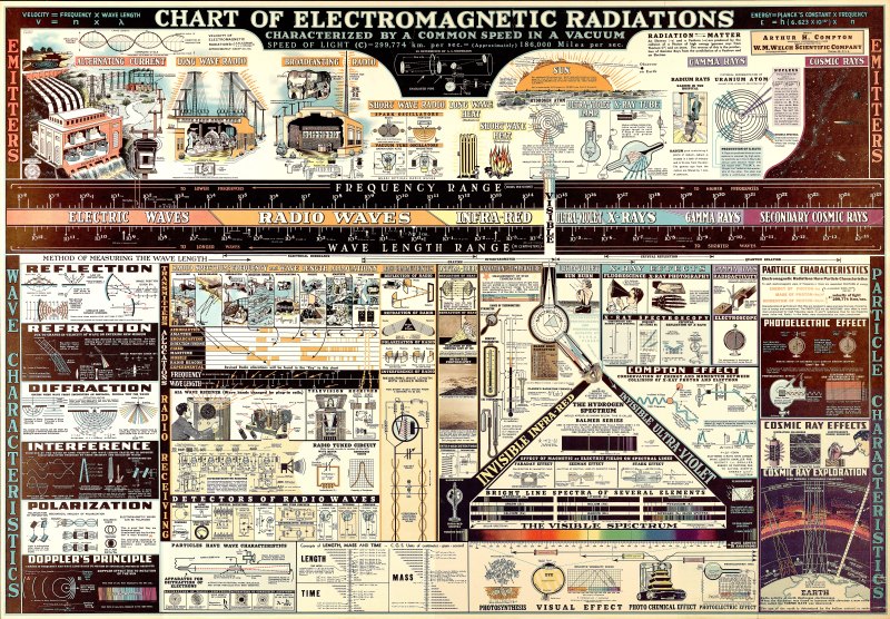 This is a chart of the electromagnetic spectrum, published by the W.M. Welch Scientific Company in 1944, and posted online about three years ago. It covers electromagnetic radiation from simple diffraction to cosmic rays, and shows the frequency allocations and their historic use across the spectrum. (full resolution image is here)