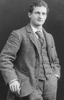 Early 1890s fashion includes gray coat with covered buttons and matching waistcoat, dark trousers, short turnover shirt collar, and floppy bow tie. The short hair and pointed beard are typical. The overall silhouette of the 1890s was long, lean, and athletic. Hair was generally worn short, often with a pointed beard and generous moustache.