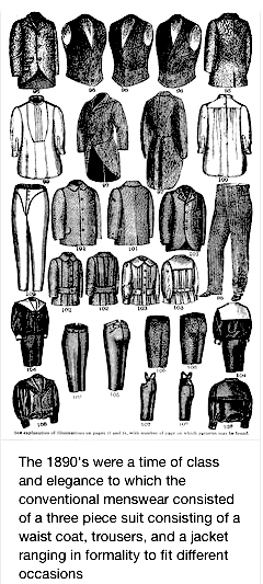 In general the dress code is white shirts, ties in conservative colors, black, gray or brown suit jackets, vests and pants, and dark brown or black casual or dress shoes. No t-shirts, jeans or sneakers. Hats won’t be on inside the lecture hall but could be placed on your lap and canes next to the seat. It is not necessary to be literal, but to wear clothing from the present that would not seem out of place in 1890s New York. Other important characteristics are short hair, clean shaven, mustache or beard. For more information and pictures of men’s fashion from the late 19th century, continue reading below.