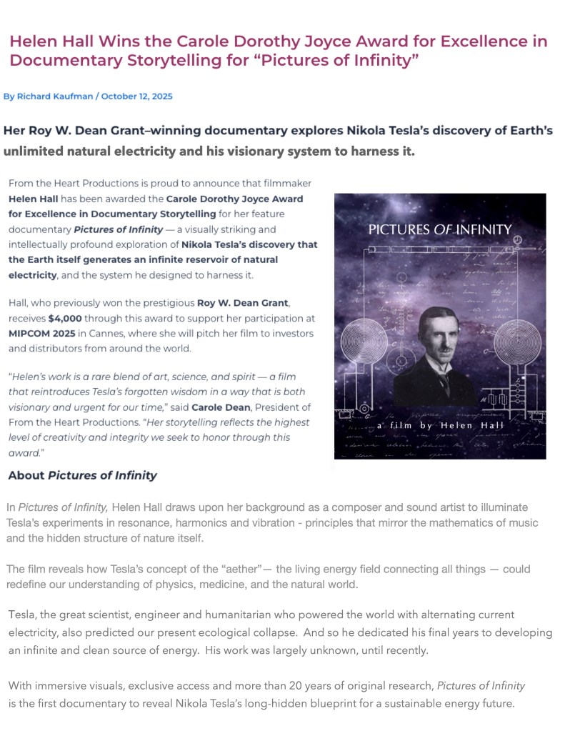 Pictures of Infinity Wins Award for Excellence in Documentary Storytelling I am honored to receive the Carole Dorothy Joyce Award for Excellence in Documentary storytelling for Pictures of Infinity.