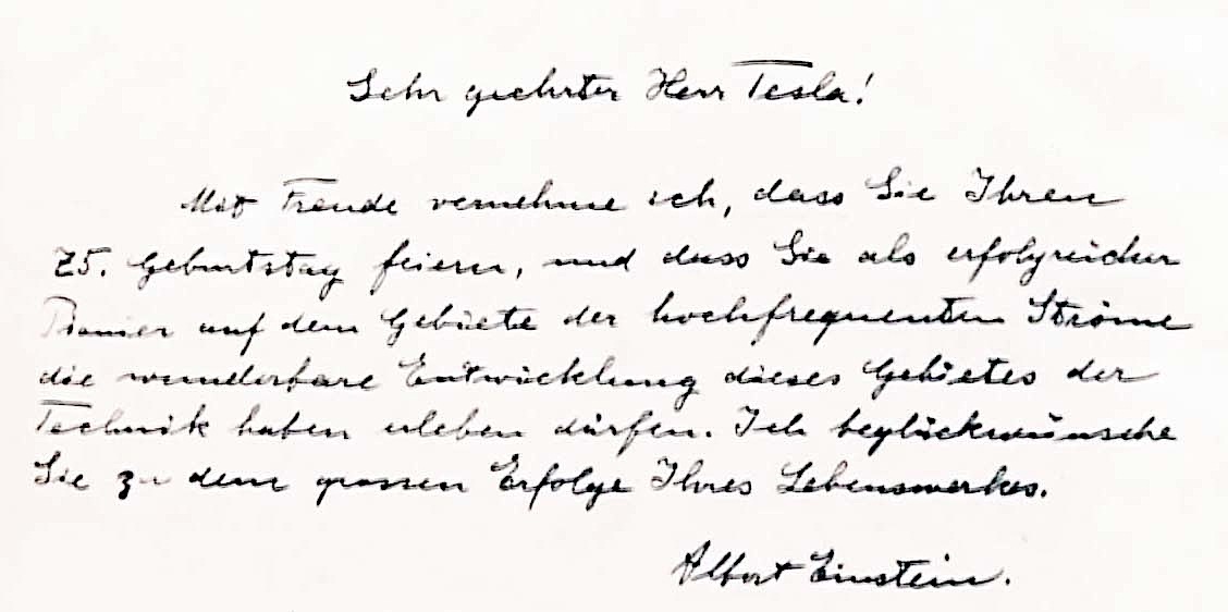 Letter from Albert Einstein to commemorate Tesla’s 75th birthday, 1931