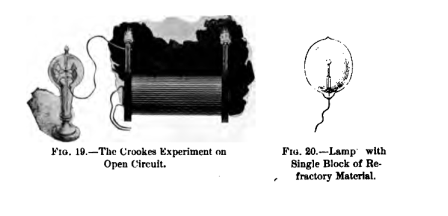 All this would point to the possibility of obtaining a much higher efficiency with such a lamp than is obtainable in ordinary lamps. In my experience it has been demonstrated that the blocks are brought to high degrees of incandescence with much lower potentials than those determined by calculation, and the blocks may be set at greater distances from each other. We may freely assume, and it is probable, that the molecular bombardment is an important element in the heating, even if the globe be exhausted with the utmost care, as I have done; for although the number of the molecules is, comparatively speaking, insignificant, yet on account of the mean free path being very great, there are fewer collisions, and the molecules may reach much higher speeds, so that the heating effect due to this cause may be considerable, as in the Crookes experiments with radiant matter.