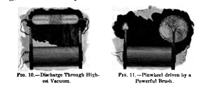 The streaming discharge of a high tension induction coil differs in many respects from that of a powerful static machine. In color it has neither the violet of the positive, nor the brightness of the negative, static discharge, but lies somewhere between, being, of course, alternatively positive and negative. But since the streaming is more powerful when the point or terminal is electrified positively, than when electrified negatively, it follows that the point of the brush is more like the positive, and the root more like the negative, static discharge. In the dark, when the brush is very powerful, the root may appear almost white. The wind produced by the escaping streams, though it may be very strong—often indeed to such a degree that it may be felt quite a distance from the coil—is, nevertheless, considering the quantity of the discharge, smaller than that produced by the positive brush of a static machine, and it affects the flame much less powerfully: From the nature of the phenomenon we can conclude that the higher the frequency, the smaller must, of course, be the wind produced by the streams, and with sufficiently high frequencies no wind at all would be produced at the ordinary atmospheric pressures. With frequencies obtainable by means of a machine, the mechanical effect is sufficiently great to revolve, with considerable speed, large pin-wheels, which in the dark present beautiful appearance owing to the abundance of the streams (Fig. 10 / 106).